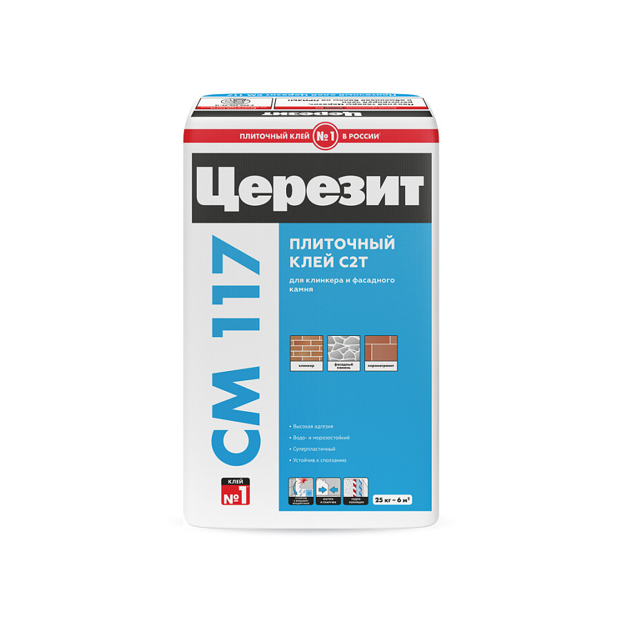 Клей СМ 117 предназначен для крепления всех видов минеральных плиток – керамических, керамогранитных, клинкерных, каменных (кроме мраморных) и т.п., на недеформирующихся минеральных основаниях (таких как бетон, цементные стяжки, цементные и цементно-известковые штукатурки), на стенах и полах, внутри и снаружи зданий.